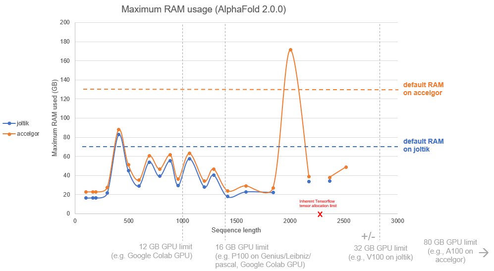Looking at GPU limits, it is possible to run sequences of up to approximately 1000 residues on any 12 GB GPU, such as the ones that are sometimes allocated on Google Colab, of up to 1400 residues on 16 GB GPUs that are available on KULeuven, VUB and Google Colab systems. Larger GPUs, such as the 32GB, 40GB and 80GB units at the KULeuven/UGent/VUB clusters, can host sequences of almost 3000 residues and more.