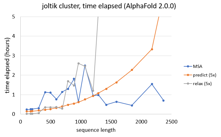 As also seen for the memory requirements of the MSA search, the time elapsed does not necessarily solely depend on sequence length. Longer sequences do not necessarily require more time than shorter ones.