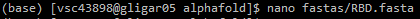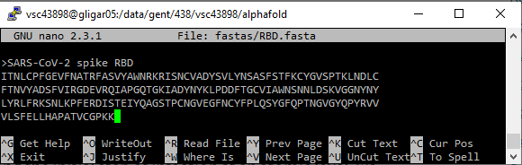 nano to create or edit text files. Pasting content from the clipboard can be achieved by right clicking the terminal window. To save a file in nano, press Ctrl+O and Enter. To exit, press Ctrl+X. If the file is changed but not yet save, nano will prompt you; insert Y and press Enter to save modifications, insert N and press Enter to discard them.The FASTA file should contain either a single protein sequence (for monomer folding), or multiple sequences when folding protein complexes with AlphaFold-Multimer.