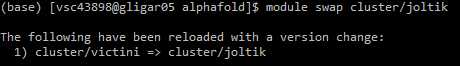 Before you can submit the job script, you need to swap to the correct cluster. As AlphaFold runs on GPU, options here are limited. For example, for Ghent University users the joltik cluster is available. Swap to the appropriate cluster using the module swap cluster/joltik command: