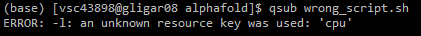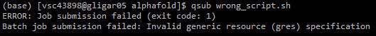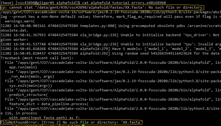 $VSC_DATA/alphafolddirectory, and will be named<job_name>.e<job_id>(for instance:example_run.e1502930). Display its contents withlessorcat. The actual error message is most often found at the bottom of the file.