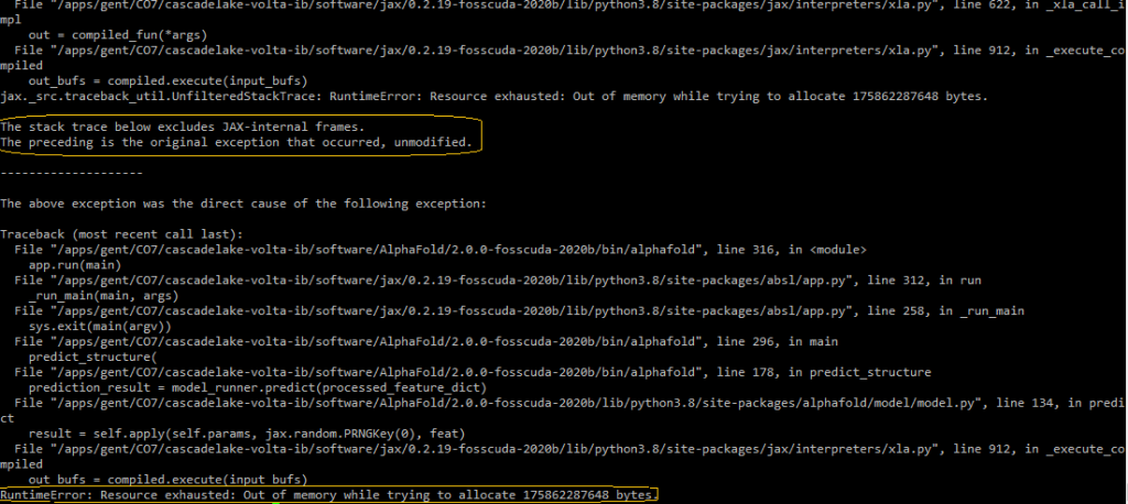 When attempting to run AlphaFold on the HPC, you might be confronted with a variety of errors, originating from several sources. Most commonly, they will be a result of a wrong configuration or resource exhaustion (e.g., when running large proteins or proteins with too large MSAs). The most common errors are enlisted below, along with possible workarounds to solve them.