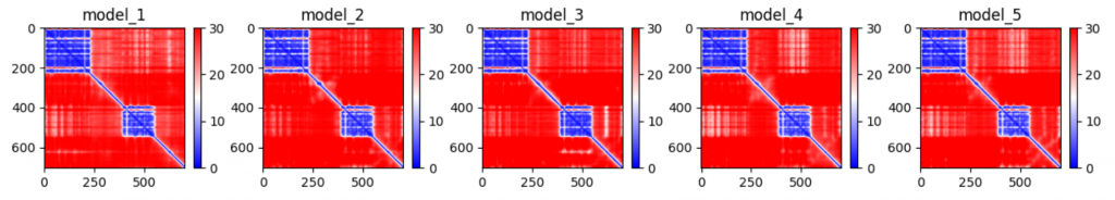 Another key part of training is called self-distillation. Here, an initial model is trained on the PDB, after which it predicts 300’000 structures from new sequences. These are then used together with the PDB structures in training the five final AlphaFold models.