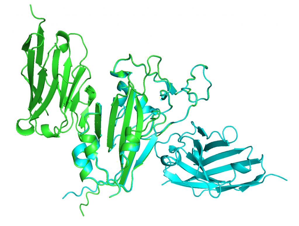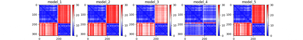 In these visualizations, the fourth model (which ranked first, with a PTM of 0.85) shows the greatest confidence, with both chains aligning very confidently to one another. You can see that the models with much lower PTM scores do not show this characteristic (because of the red blocks). This means that AlphaFold does not predict the interaction properly, despite predicting the chains with high accuracy.