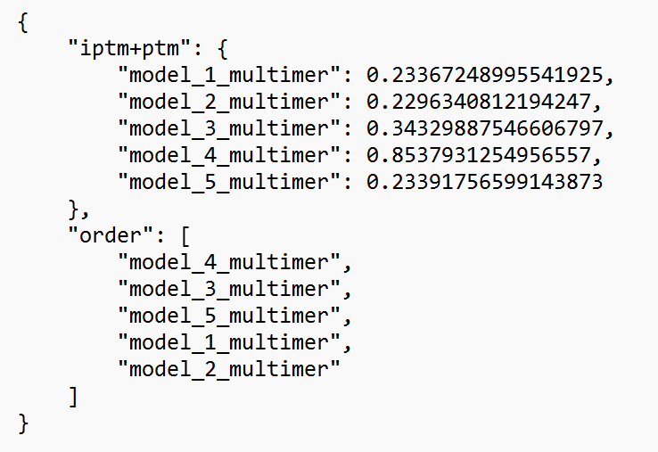 In this file, the PTM score (“iptm+ptm”) is given for each of the five predicted structures. The closer to one, the greater the overall confidence for the model (note: for multimer structures, the weight of the interface region is greater than the other regions). You can see that model #4 is ranked first (in the order part), as it achieves a PTM of 0.85, where other models do not go above a score of 0.34. We can conclude that this fourth model has a high confidence, whereas the other four models are low in confidence.