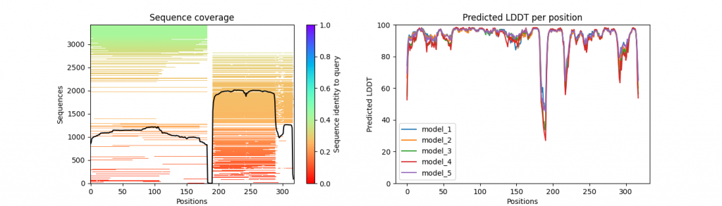 An illustration of the MSA coverage and sequence similarity, together with the pLDDT per position for each of the five models.