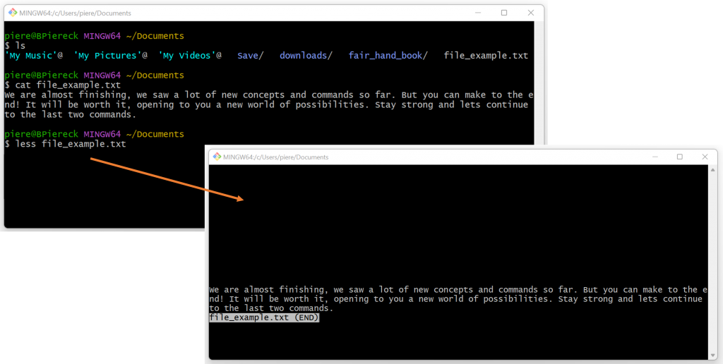 You will now need some sugar in your brain so chocolate mousse is in order: to print the contents of the mousse recipe to your terminal you can either the cat command (concatenate files) or the less command (paginate text; you can press the <q> key to quit pagination early; arrow keys or <space> to scroll).