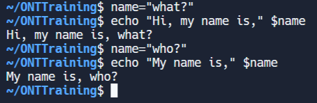 Now a piece of memory in my computer is reserved for storing the value “what?” and that piece is called name. This is called an assignment: you assign a value to a variable. You can create variables in your script or you can create them on the command line. They will be alive until you close the terminal.
