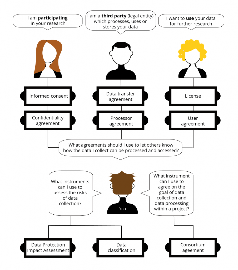 To arrange the security of the research data you work with, in many cases you have to make a (legal) agreement with other people involved. These agreements will make explicit permitted uses, retention time, and agreed upon security measures. Find out what legal contracts you can use by studying the figure below. Visit the Guide Legal instruments and agreements for more information.